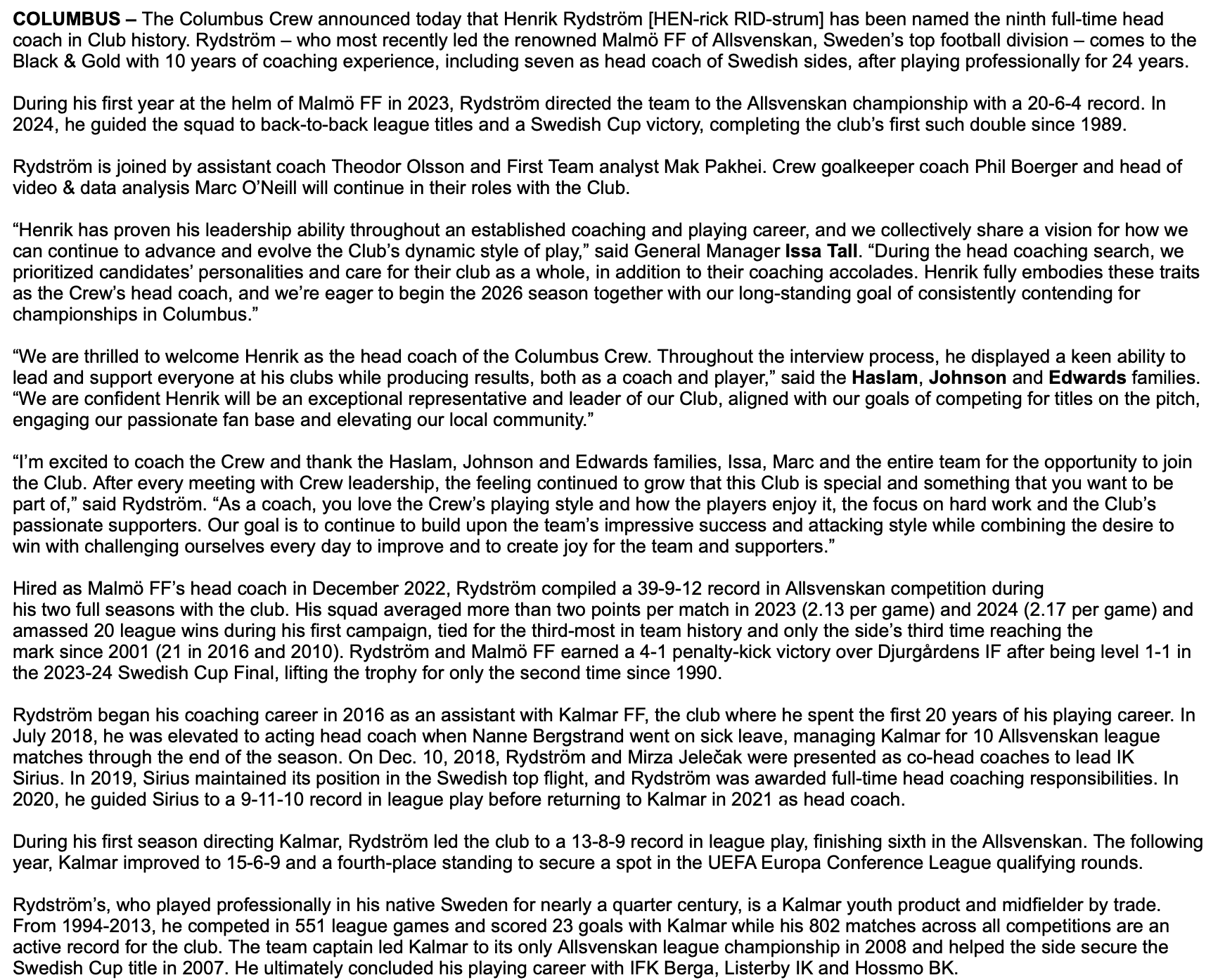 - Rydström will be bringing two assistants – Theodor Olssen and Mak Pakhei – with him to Columbus. His staff will also include two current Crew assistants – goalkeeper coach Phil Boerger and video coach Marc O'Neill.