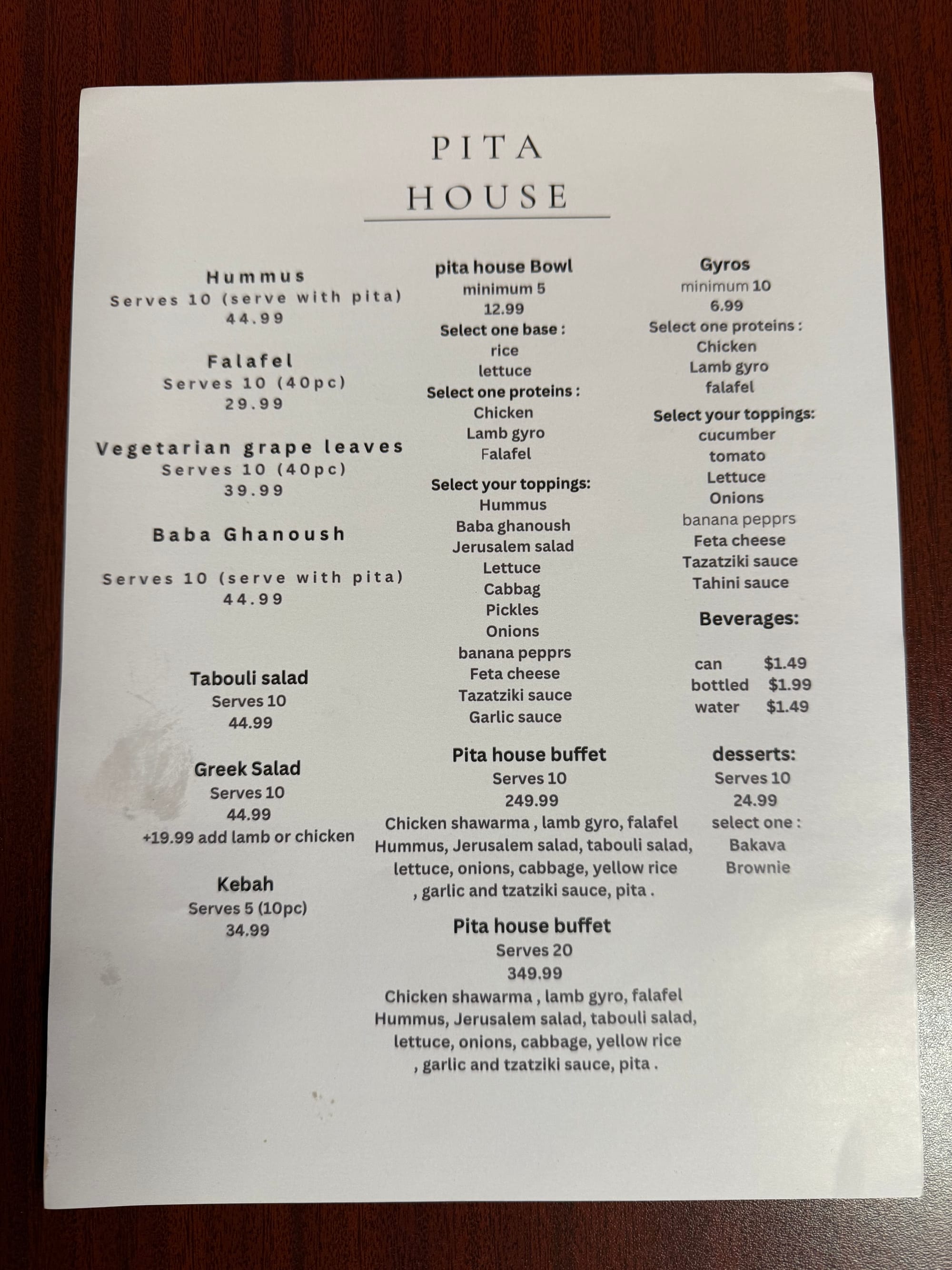 I've been patronizing Pita House for more than a decade. There are Greek offerings here but, generally speaking, there's a tilt toward the Middle Eastern. It's Always solid. Always. Take a good look behind the glass at the steam table, which teams with a wide variety of offerings, before you order. The eggplant salad is my favorite.