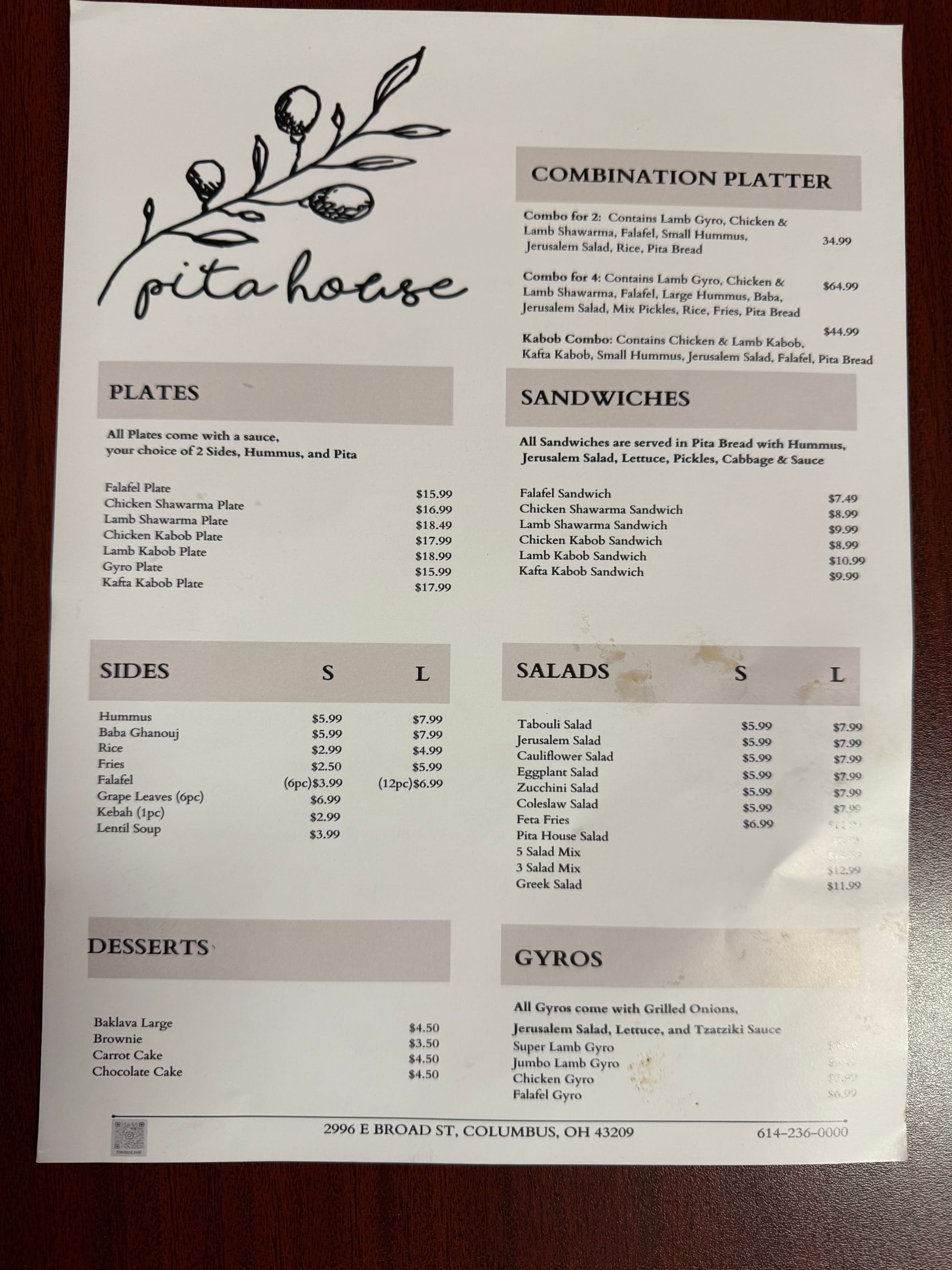 Clockwise from top left: Pita House by day. Pita House by night. One side of menu. My usual: The gyro plate with eggplant and cauliflower salads, topped tzatziki, with included hummus and warm pita. The flip side of the menu.