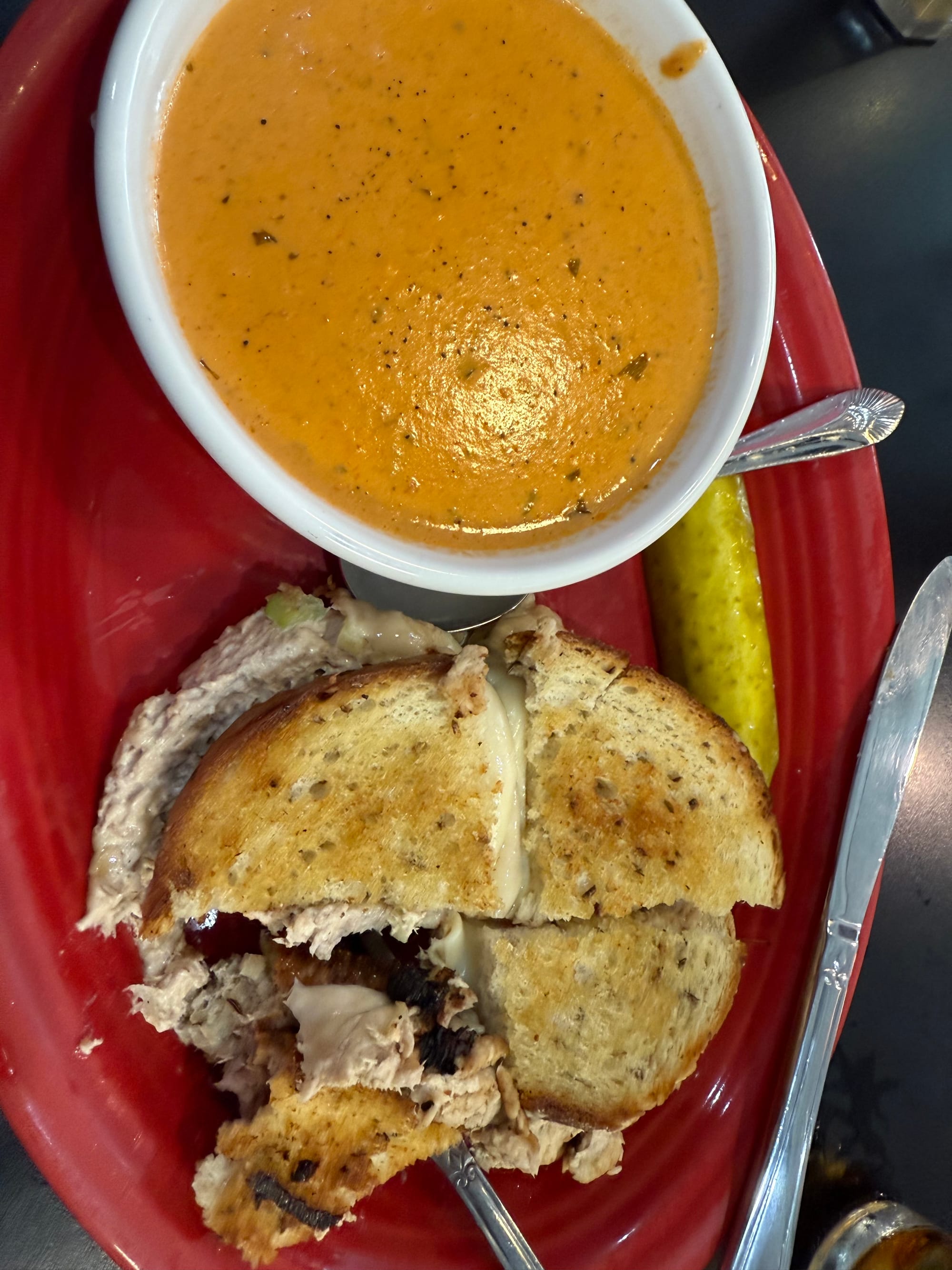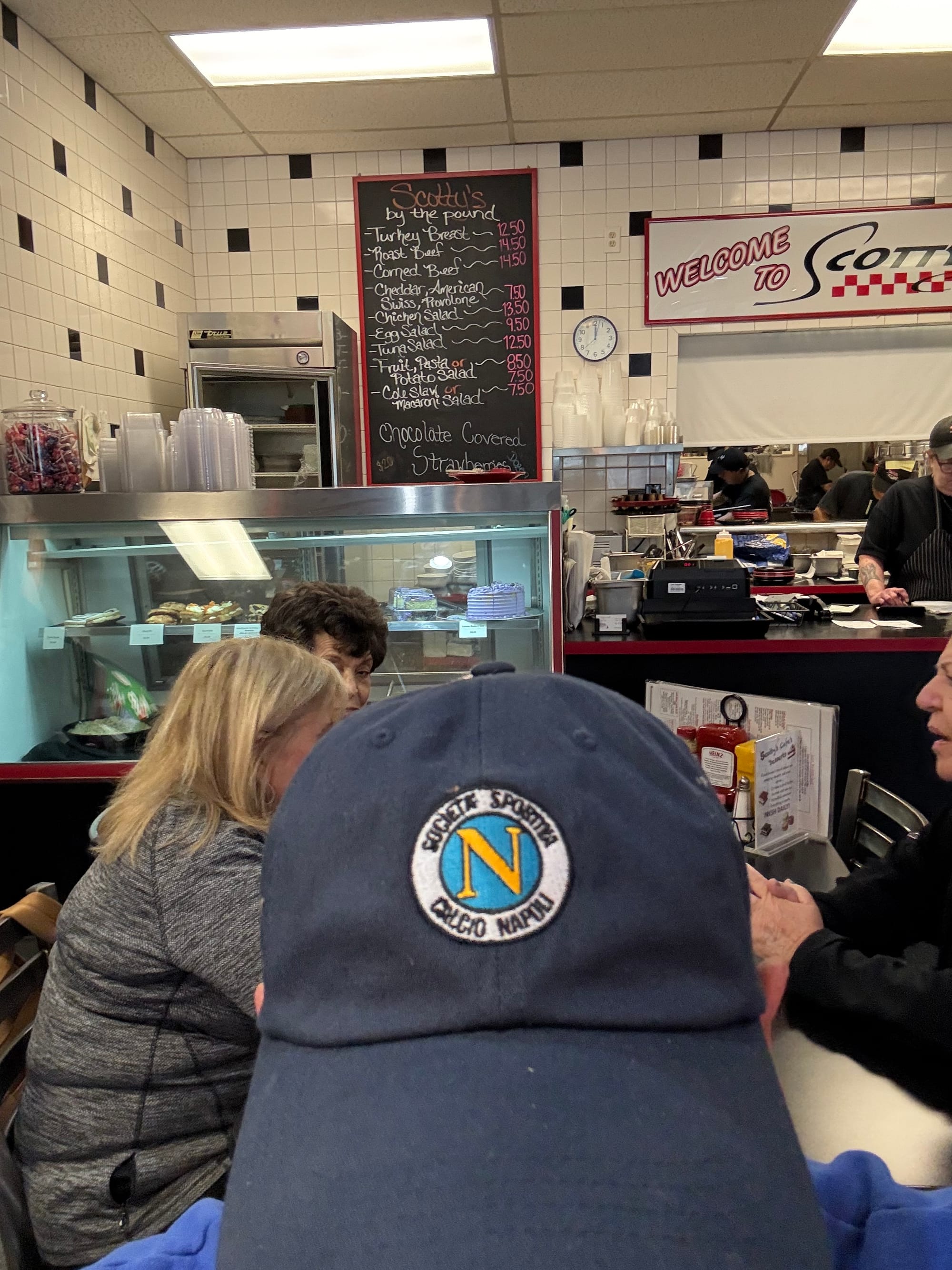 The special at Scotty's Cafe Friday was a barbecued half chicken with sides and cornbread. All homemade. I'm pretty sure I heard the special price, but it was so low, I don't trust myself to post it here for fear of being wrong. We opted for the Miamian, middle, a turkey on grilled rye with cheddar cheese, grilled onion and thousand island, and an equally well-executed tuna melt, middle right, with a side of homemade tomato-basil soup. I don't normally order tomato soup when I'm out because it invariably comes to of a can. Not so here. Top right: Scotty has a full deli and dessert case in the back of the dining room. Bottom left: Scotty working the tables, a common sight. If it's your birthday, he will compel everyone in his place to sing. He is irresistible.