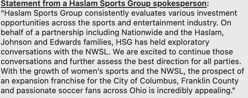 Hunt Sports Group and the Edwards family, owners of the Crew, confirmed that they are in pursuit of an National Women's Soccer League franchise for Columbus. They issued the following statement Friday: