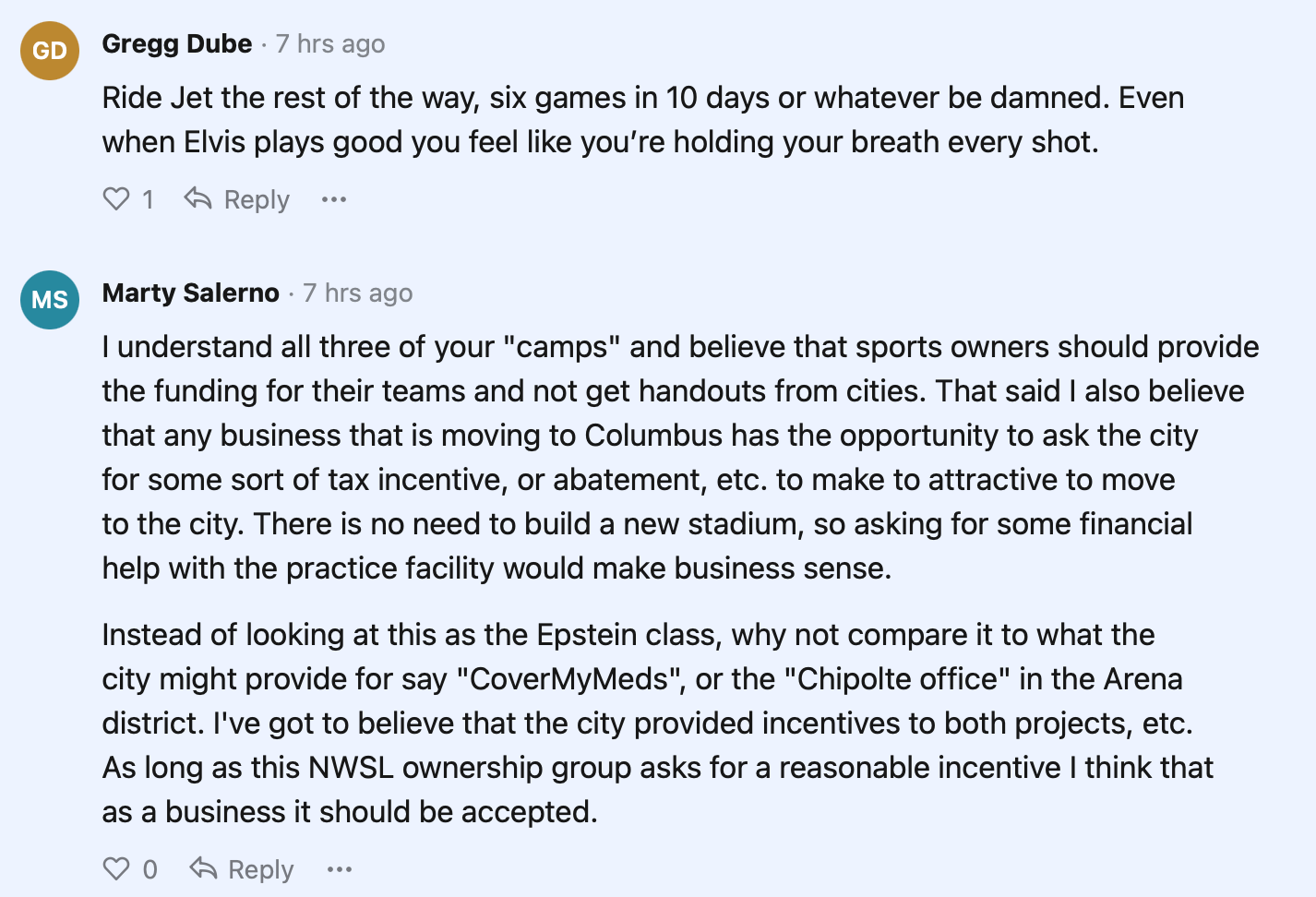 Also in this post was a word about the NWSL-to-Columbus bid, and the announcement from Columbus City Council that an agreement had been reached on a subsidy: The city will loan Haslam Sports Group, et al, $25 million for the construction of a NWSL-team-oriented training facility on the grounds of McCoy Park on the Southwest side, and for a new locker room to be built for the women at the new Crew Stadium. The loan will be repaid via a 2% tax levy on tickets to events at the new Crew stadium.