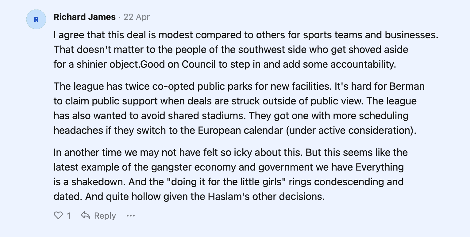 Monday, the Columbus City Council held their nose and voted for a plan to give $25 million to the NWSL bidders. The money is to go toward renovating a city park the city ceded to the NWSL bidders, and to build a women's locker room at the new Crew stadium (aka Fertilizer Field). The renovated park will serve as the training ground for the new team.