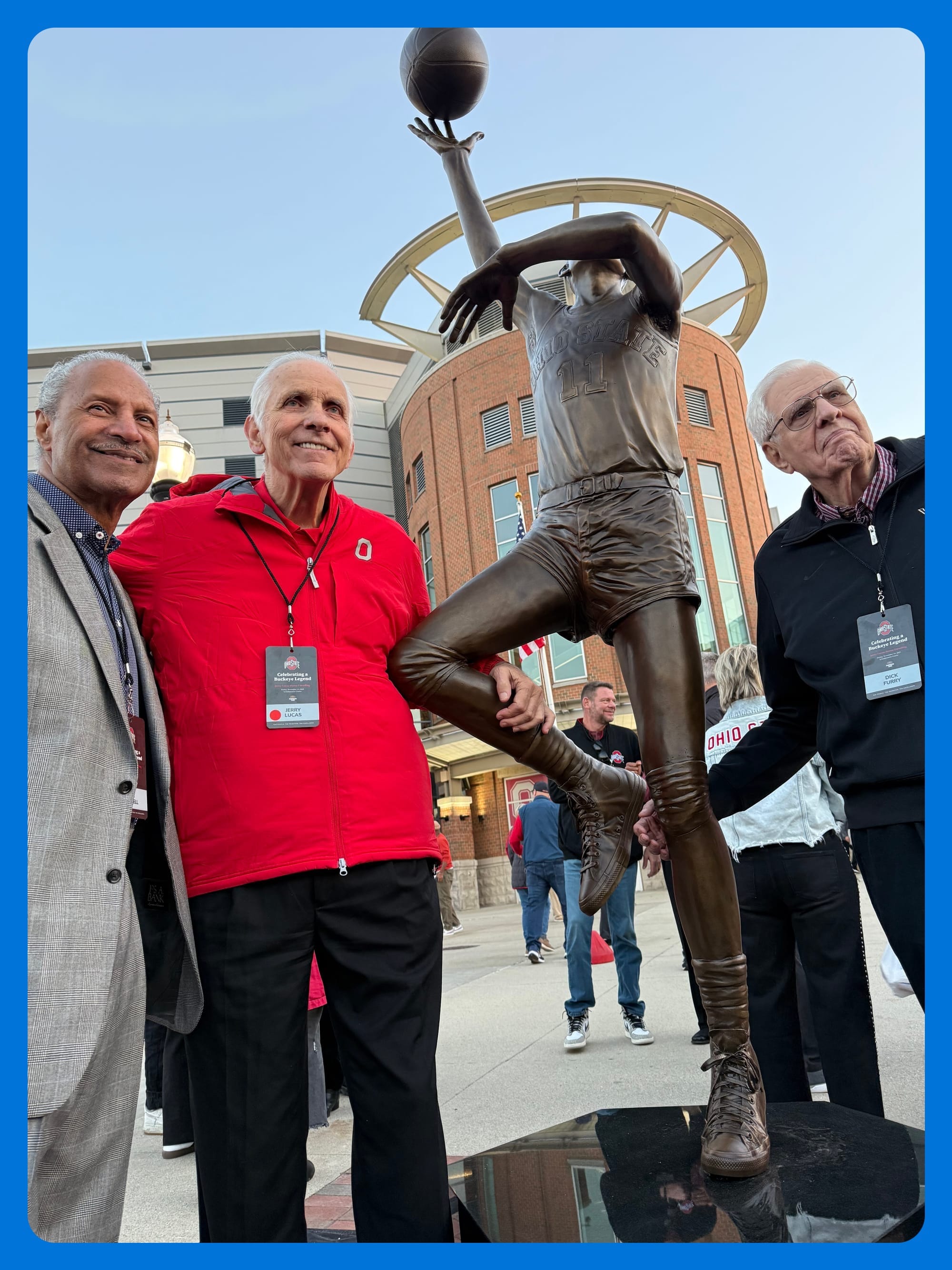 Lucas confirmed that the bronze is based on a well-known photo of him sweeping the shot over Cincinnati center Paul Hogue. He and his old Buckeyes loathed Cincinnati – the team that beat them in the '61 and '62 NCAA title games. He can stick that hook in Hogue's face for eternity.